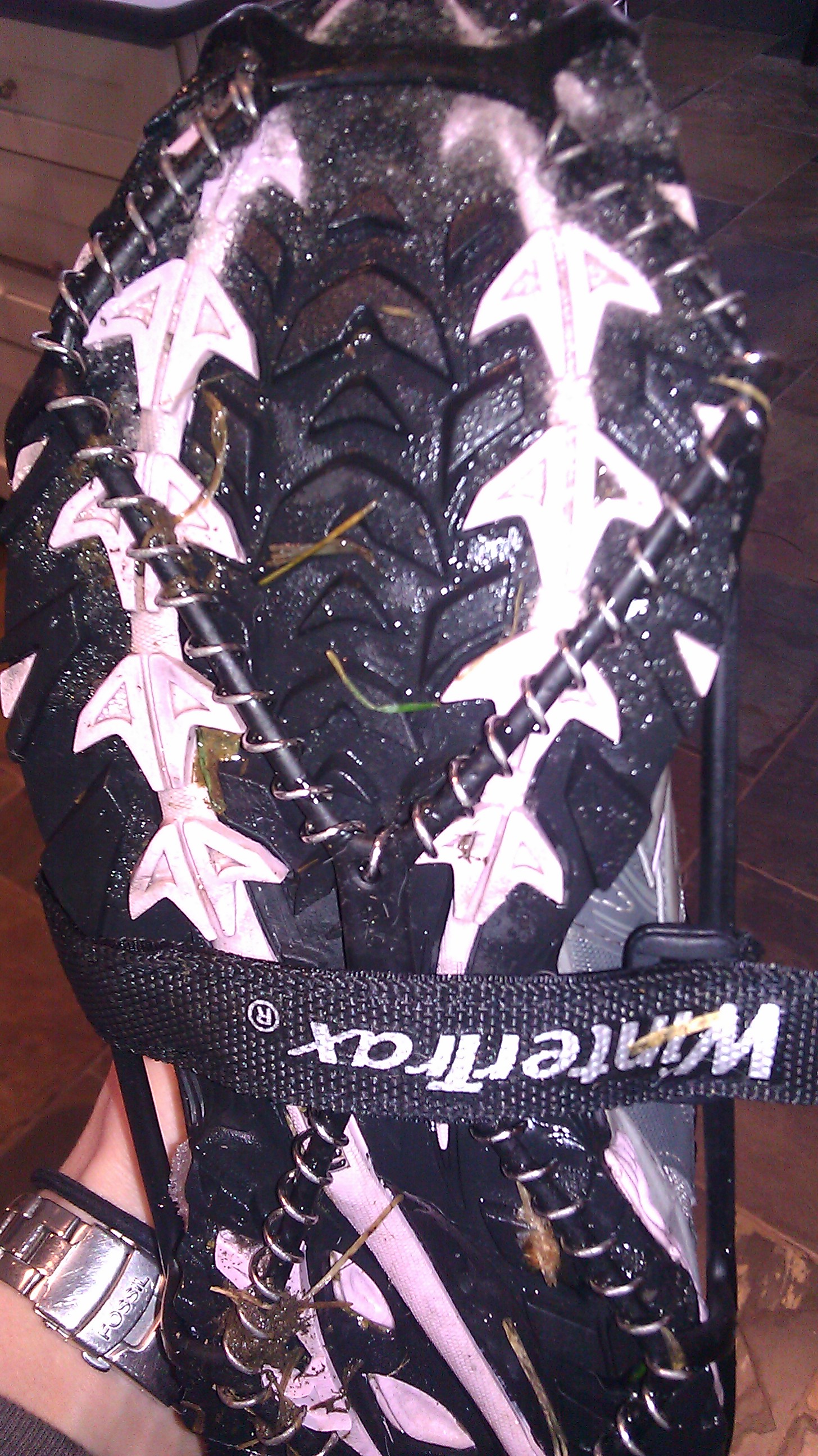 The freezing rain from yesterday is still manifesting itself all over everyone’s driveways and sidewalks.  Which is why I knew I had to come up with a way to fight back.  I couldn’t stand the thought of Jack being cooped up again without an afternoon walk.  Luckily, some brain power kicked in and I remembered Rob and I bought these clamp things last winter for hiking in the snow.  Let’s just say the ice has met it’s match.  I didn’t even come close to wiping out once. Neener neener neener!